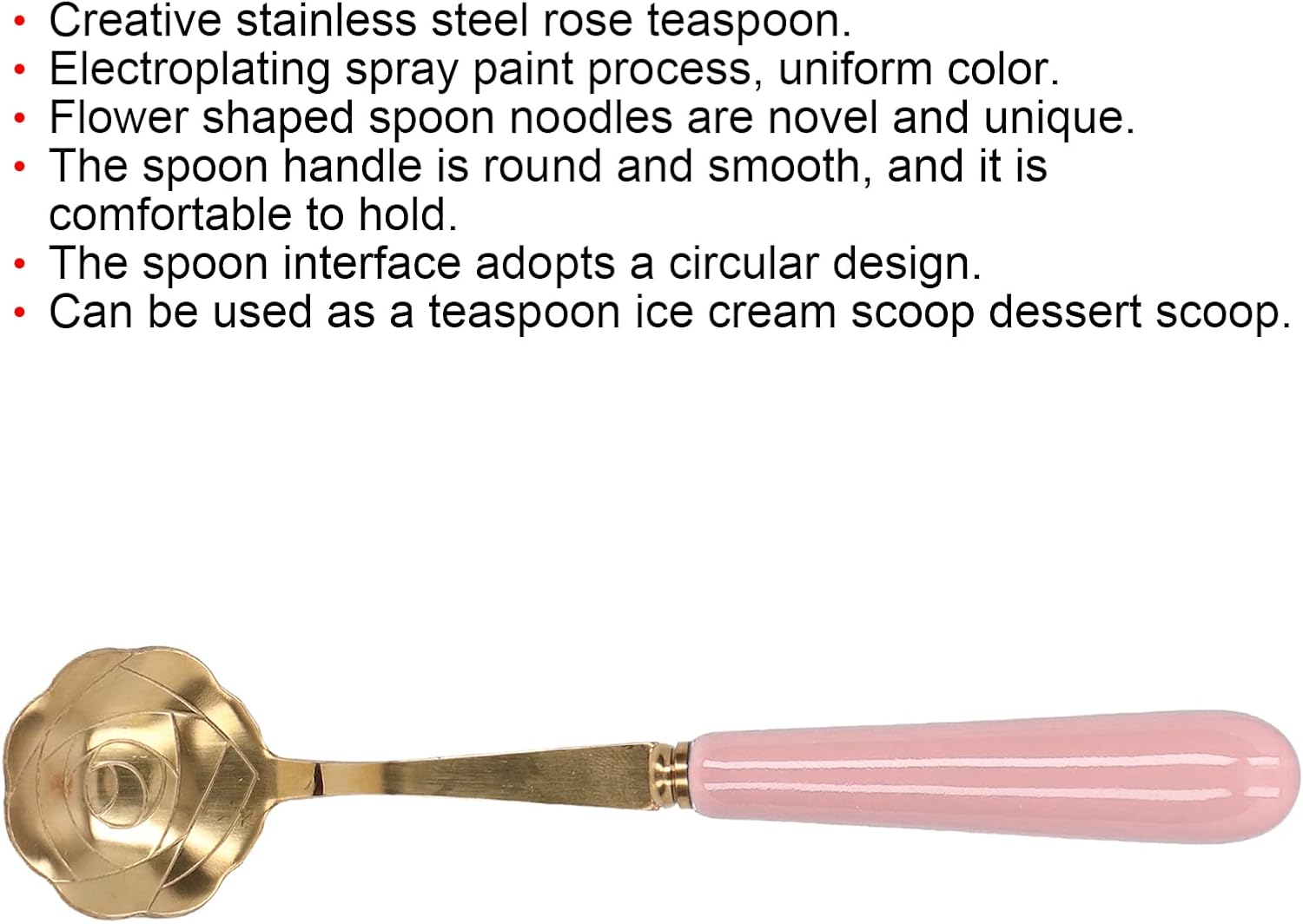 Creative Teaspoon Design: This teaspoon combines stainless steel construction with delicate detailing, provided in elegant golden and rose tones, paired with a smooth ceramic handle option. Coffee spoons serve as a practical teaspoon for daily drinking and eating, while also doubling as a cute cake spoon for dessert time, tea spoons bringing both functionality and decorative charm to table scenariosUniform Color Finish: Crafted with electroplating and spray painting techniques, the tea party flower fancy tableware set features an even and consistent color layer all over the body. The bowl of the dessert spoons is designed into a lovely flower shape, with a distinctive and eye-catching look that stands out from ordinary flatware, sugar spoon adding a delicate touch to every meal or snack timeItem Type: TeaspoonMaterial: Stainless SteelSize: Total Length Approx. 13cm / 5.1in, Spoon Diameter Approx. 2.7cm / 1.1inGross Weight: Approx. 37g / 1.3ozPackage List:5 x Flower Shaped Teaspoon