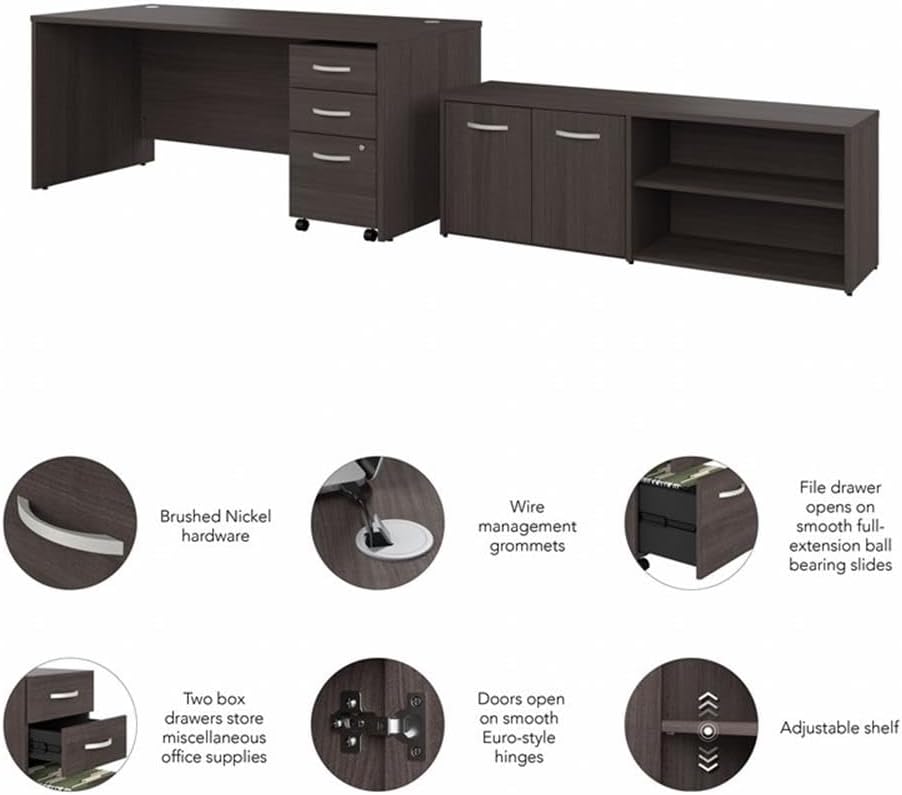 The Bowery Hill 72W x 30D Office Desk with Storage Return and Mobile File Cabinet offers a stylish, long-lasting workspace solution for today's professionals. Tackle your next project with a computer, books and more on a desktop that supports up to 200 pounds. Two built-in wire management grommets keep cords and cables in order, so your work area remains free from clutter. The filing cabinet's bottom drawer accepts letter, legal and A4-size paperwork while a pair of box drawers organize supplies. The storage credenza's open and closed compartments each include one fixed and one adjustable shelf to accommodate everything from reference materials to decorations. This desk set has been meticulously tested to meet or exceed ANSI/BIFMA quality standards for safety, durability and performance and is backed by a 10 Year Warranty. American made with U.S. and imported parts.Features:- Bundle includes: 72W x 30D Office Desk, 3 Drawer Mobile File Cabinet, Low Storage Cabinet with Doors and Shelves- Durable Computer Desk supports up to 200 pounds and is designed for maximum stability; includes hardware for anchoring to a wall- Desktop includes built-in wire management to keep cords and cables out of the way- Office credenza's open and closed storage areas each contain one fixed shelf and one adjustable shelf to accommodate items of various sizes- Rolling File Cabinet's bottom drawer accepts letter, legal and A4-size paperwork while two box drawers store small office supplies- Filing cabinet features a single lock that secures the two bottom drawers to protect sensitive documents and personal items- Available in several contemporary and traditional finishes to complement any office- Bowery Hill's commitment to safety includes rigorous testing that meets or exceeds ANSI/BIFMA standards- Backed by a 10 Year Manufacturer's WarrantySpecifications:- Product Weight: 283.1 lbs