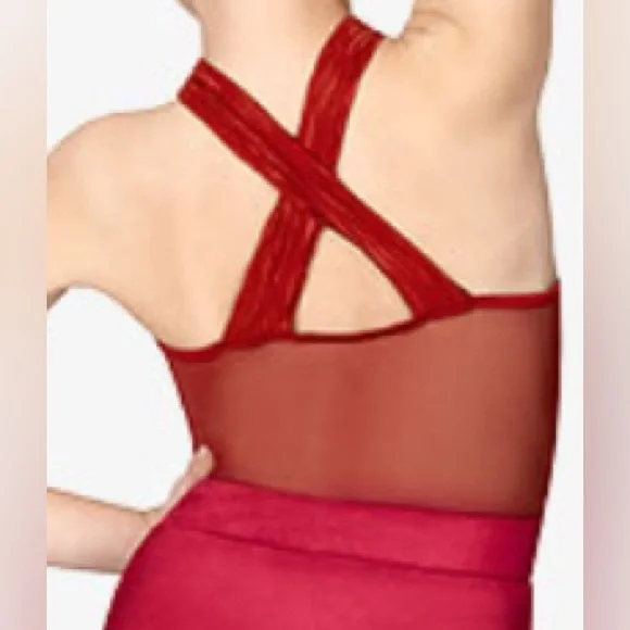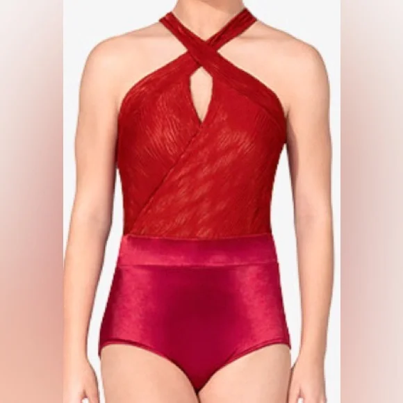 Stunning red halter style dance costume leotard performance outfit. * Halter Neck: The leotard features a halter neckline with straps that cross over at the front, creating a keyhole cutout just below the collarbone. * Crisscross Bodice: The bodice has a wrap-style design with the fabric crisscrossing at the front, creating a visually interesting texture. * High-Waisted Shorts: The bottom portion is designed like high-waisted shorts, offering more coverage than a traditional leotard cut.Materials and Texture: * Shiny Fabric: Both the top and bottom appear to be made of a shiny, possibly metallic, fabric. * Textured Bodice: The fabric of the bodice seems to have a textured or pleated effect, adding depth to the design.Color: * Red: The leotard is predominantly red, with the top and bottom in slightly different shades of the color. The top appears to be a brighter, more textured red, while the shorts are a deeper, smoother red.Overall Impression:This leotard is a modern and stylish piece of dancewear. The combination of the halter neckline, crisscross bodice, and high-waisted shorts creates a unique and flattering silhouette. The shiny fabric and textured bodice add visual interest, making it a standout piece.Features:X design neck line4 peek-a-boo cutoutsMesh backPleated bodiceCharmeuse briefFront-lined for light supportLow compressionFabric:95% Polyester / 5% Spandex