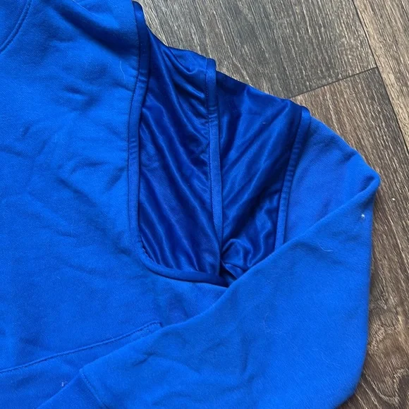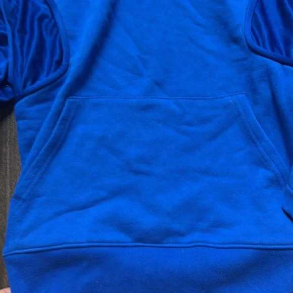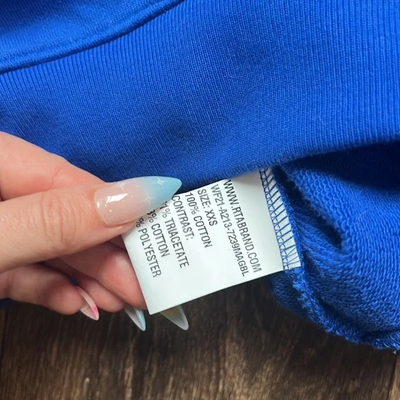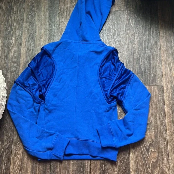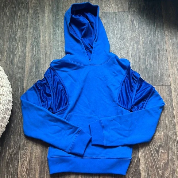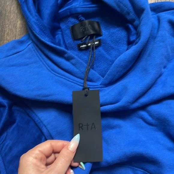 The RtA Kacey Hoodie in Magnetic Blue is a pull over style sweatshirt with shiny knit paneling on the shoulders, exaggerated piping and hood. Made in a premium Japanese fabric.DETAILS100% Cotton; 61% Triacetate 23% Cotton 16% Polyester contrastFit: Relaxed Care: Dry clean onlyMade in the USModel is 5'10" wearing size M