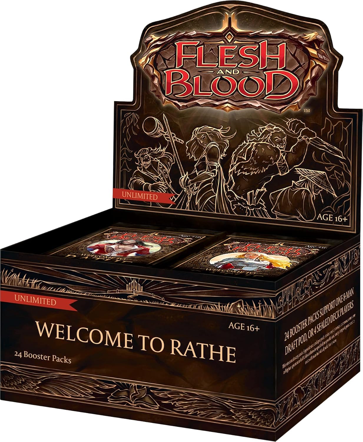 After centuries of uneasy peace, the land of rathe balances on the brink of war once again. Savage beasts emerge from the primordial jungle, clashing with noble warriors in increasingly violent skirmishes. A forgotten realm finds its ancient barriers eroding, exposing it to the greed of others, while a mystical land is faced with the history it once tried to bury, threatening to expose the secrets of their ancestors. In a world plagued by conflict, you must fight for the chance to determine your fate. Will you succumb to the machinations of others, or will you choose your own path? Pick up your sword and prepare for battle for no matter where you run, war will find you. Flesh and Blood - 100% great games! Product configuration: • 226 cards in set • 15 cards per pack + 1 token • 24 packs per display • 4 displays per case Rarity Distribution: • Premium foil - 1 per pack • Rare or higher - 1 + 1 per pack (1 Rare + 1 Super Rare/Majestic) • Equipment - 1 per pack. Common - 11 per pack