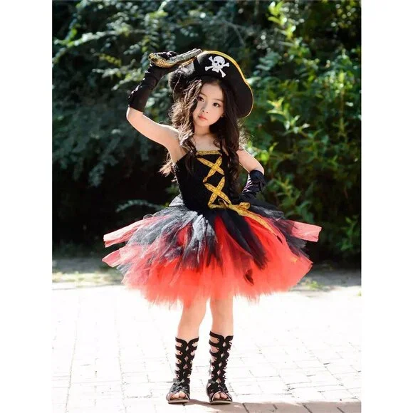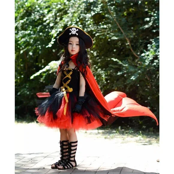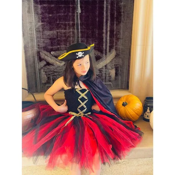 Pirates Kids Girls Costume Costume with Hat Pirates Tutu Dressed Up BlackToddler GirlsPurchase includes hat, cape, and tutu!Suitable for ages 1-13Cotton Lining Inside-Your little girl will be ready to set sail in this adorable Pirate Halloweencostume. Complete the look with mesh tights, an eye patch, synthetic boots.Get your little girl this amazing Halloween costume to make this the besttrick-or-treat season ever! We know she's going to love it!Lined dress for extra comfort and coverageCute accents, darling details, and flattering features worthy of her stylePerfect for Halloween, parades, pageants, parties, pretend play, andtrick-or-treatingHalter tutu dress with a pirate-inspired bodice, gathered tulle skirt, andmatching hatCostume includes: Dress and Pirate Hat in size range 12MON, 2T-12Y for toddlersand girls-Please allow 2-3 weeks for delivery :)-Message me for any questions and inquiries!