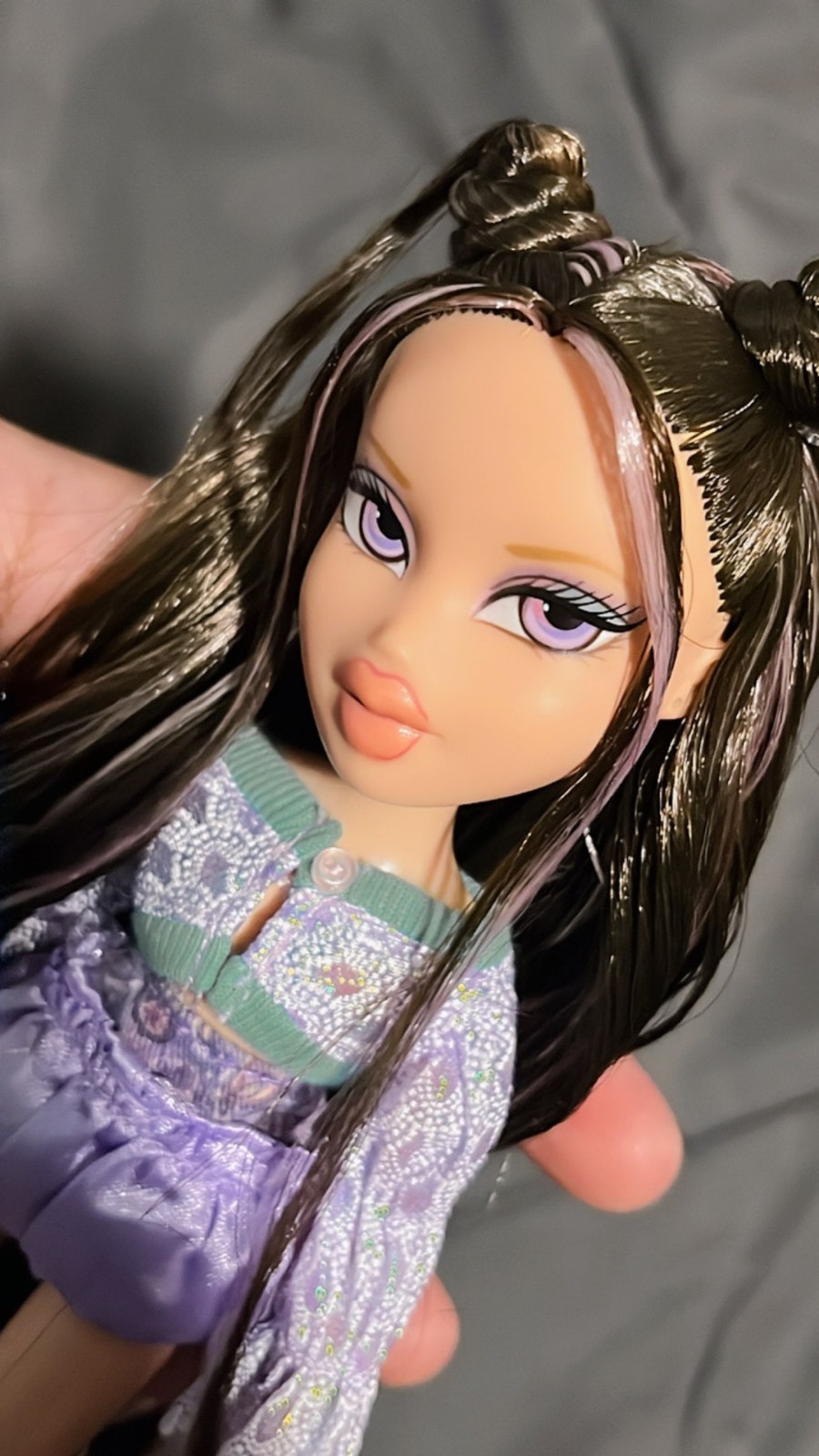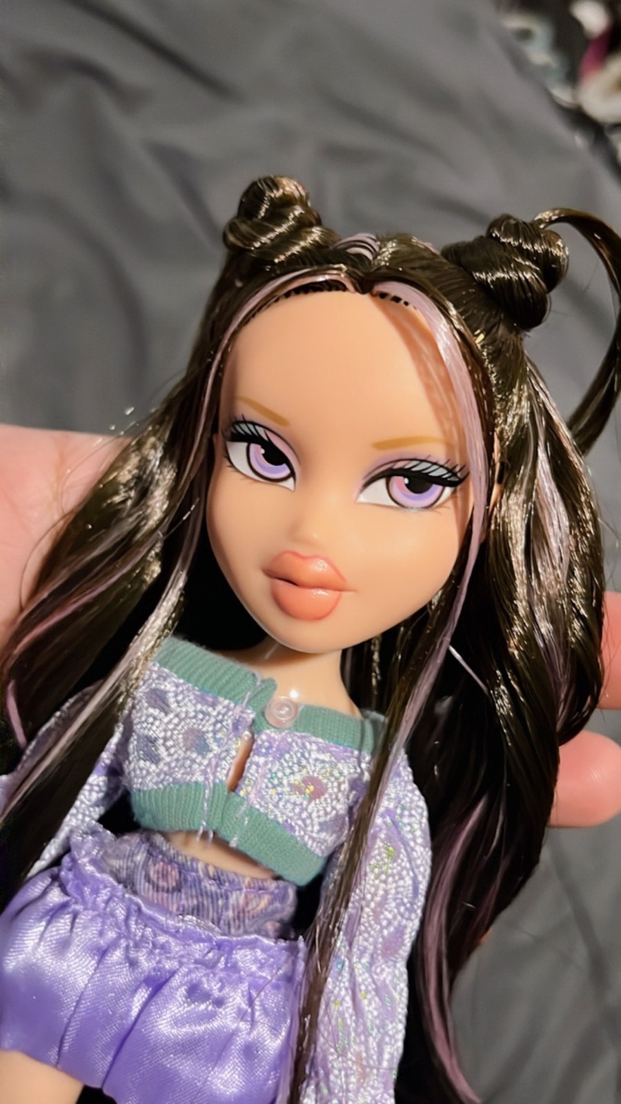 bratz sleepover Leah doll *reroot* she's fully rebooted with premium saran hair dark brown (highlights = light pink, purple, light brown) she has no chip on her eyebrows or her eyes but bit of smudge chip on her lip but it looks invisible in most angle she comes with a purple outfit with a pink stockings and a pink heels, she's in a great condition if you have more questions don't be afraid to ask me