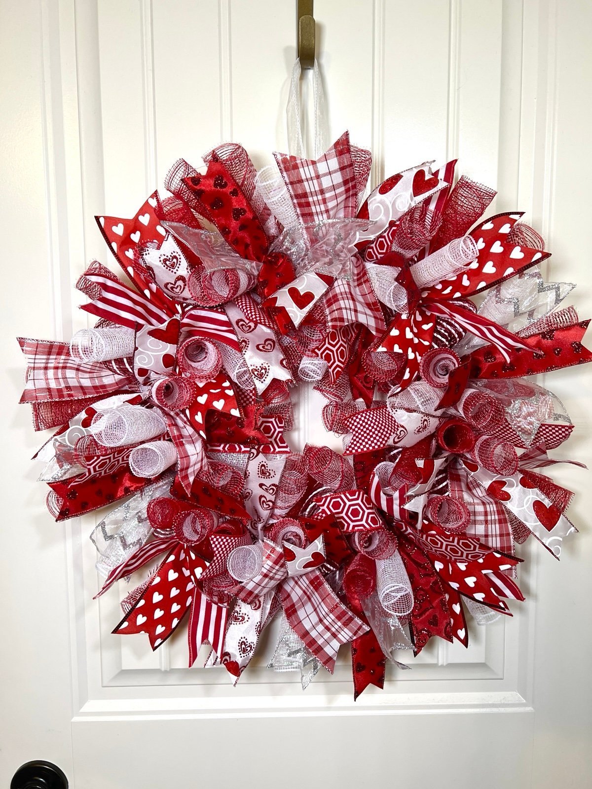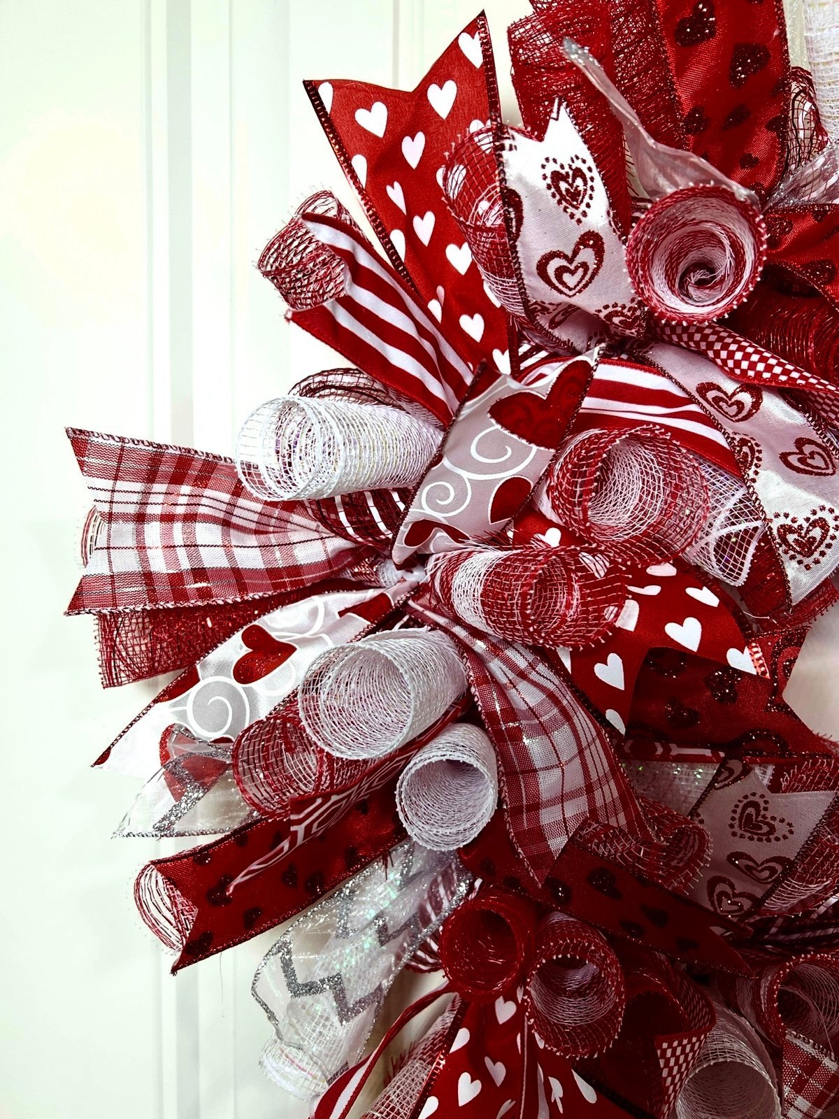 Red and white mesh (3 different styles). Valentines themed wired ribbons (10 varying styles). Red, White and Pink W/ Hearts Design.