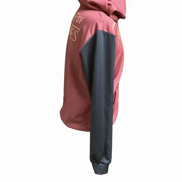 Game of Thrones Full Zip Drawstring Hoodie Magenta Body/Dark Gray SleevesYellow PrintFull Zip ClosureDrawstring HoodiePolyester with Elastane (a little stretch in the material(2) Front Slash PocketsLength: 27"Sleeve: 26"Chest: 46"Men's Size: ****tagged as 2XL; fits closer to XL****Note/Condition: Material Content Tag missing. Tagged as 2XL; fits closer to XL - Double check measurements provided. In overall GOOD Pre-Owned condition. Thanks for Stopping By!