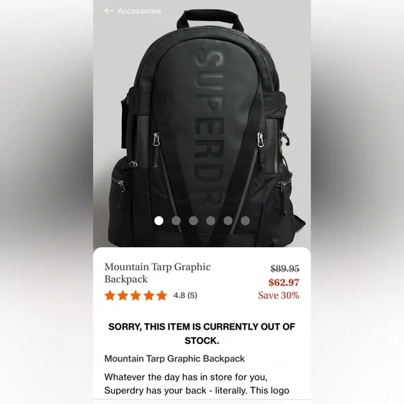 In good conditionWhatever the day has in store for you, Superdry has your back - literally. This logo branded backpack is prepared for anything thanks to its multiple pockets for easy storage of your valuables and a practical harness-like buckle that will keep your bag secured to you when you need to get moving. There's no better choice for someone with a sporty spirit, and the Mountain Tarp graphic backpack blends easily into any activewear wardrobe.Soft-touch grab handleMain zip fastened compartmentFront zip fastened compartment with inner sleevesAdjustable straps with buckle fasteningOne front zip pocketTwo side zip pocketsInternal hook and loop fastened sleeveInternal net pocket with zip fasteningBranded frontH 47cm x W 33cm x D 19cmDetails & CareMaterial 1: Polyester 100%Material: Polypropylene 100%Lining: Polyester 100%Wash: Wipe With A Damp ClothItem Code: 1078216900169