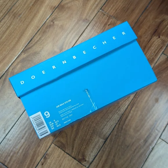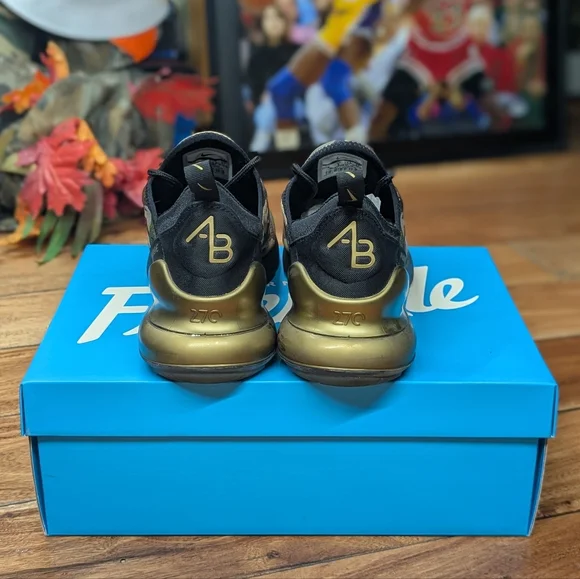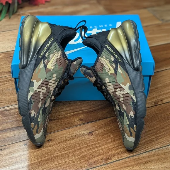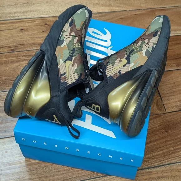 Awesome and rare Air Max 270 sneakers by Nike in size 9. Part of the Doernbecher Hospital charity event that lets child patients design a pair of sneakers. In very limited quantities you can bid or enter a raffle to purchase when the events are held.The AB 270 was designed by Aiden Barber in an awesome camo and gold colorway, with 3M hits. Only worn twice and kept in the original box!Measurements are provided in photos. All products are locally thrifted/rescued and will require wash before wear. Most pieces will show normal wear for vintage items of 20-30 year age. I ship the same, or next day depending on the order time, from the East Coast. Thank you!