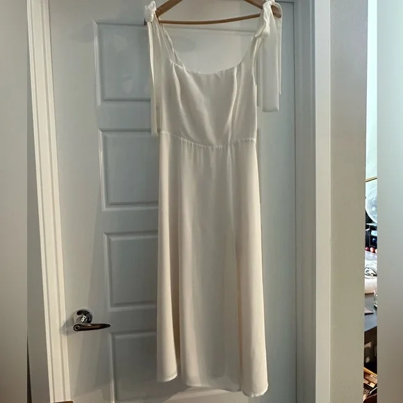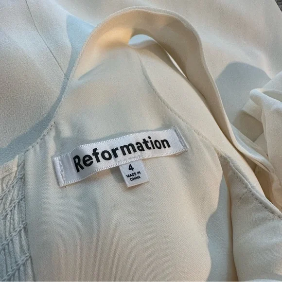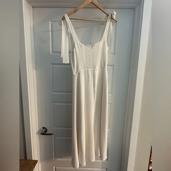 Reformation Twilight Dress Ivory Size 4 Worn Once, No wear and tearThe Twilight is fitted in the bodice with a relaxed fitting skirt, so you get structure and comfort all in one. This dress features tie straps, a smocked back bodice to provide a little bit of stretch, and a side slit to give you some breathing room.- Center back zipper- Lined bodice- Lined skirt- Side slit- Smocked back bodice- Strapless bra friendly- Tie straps