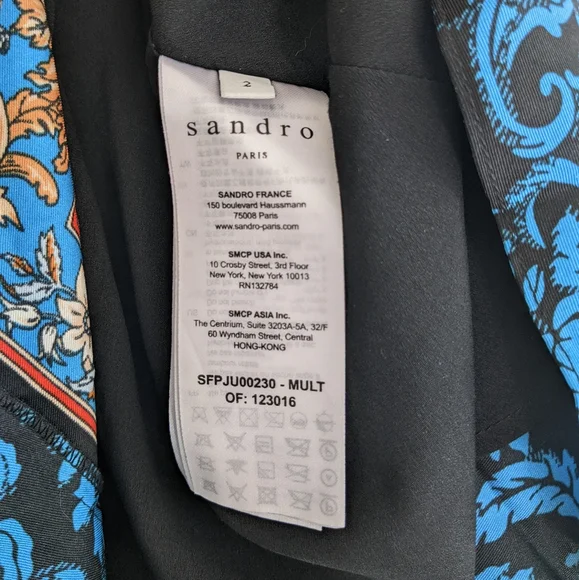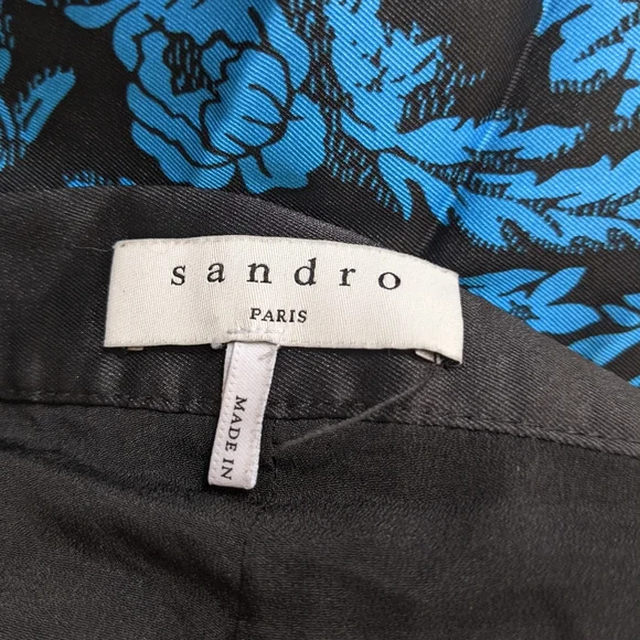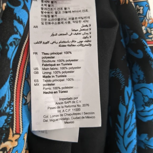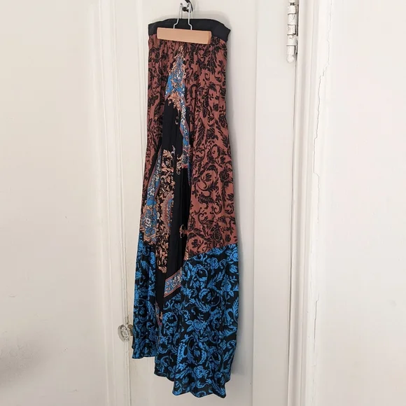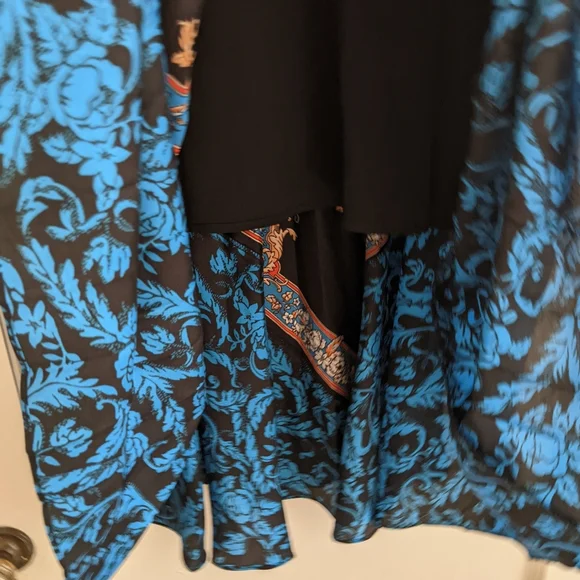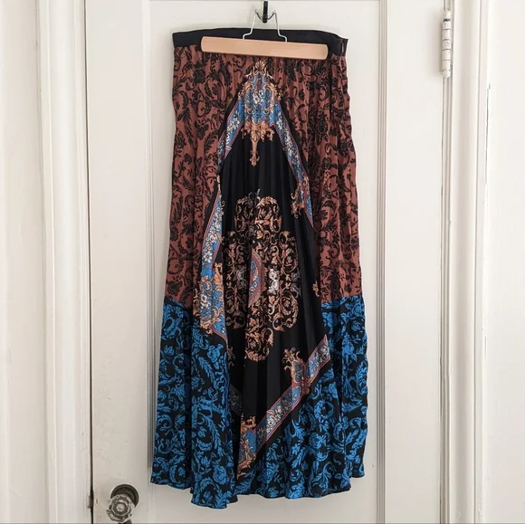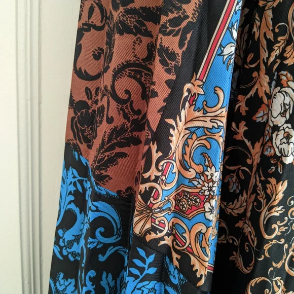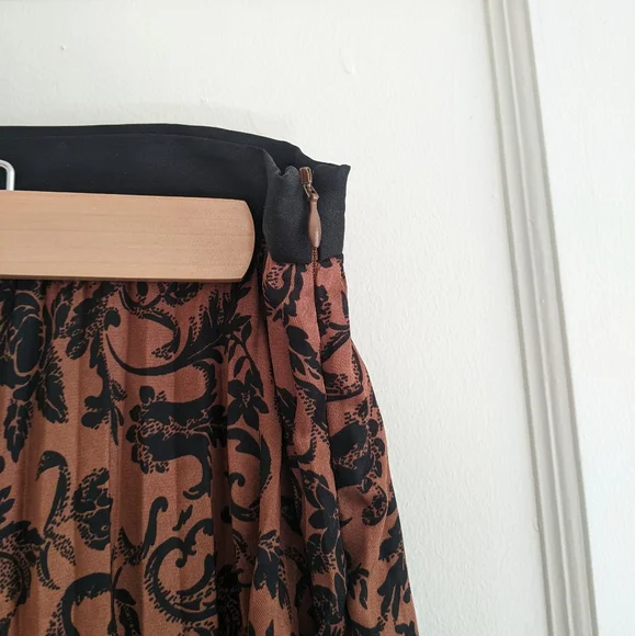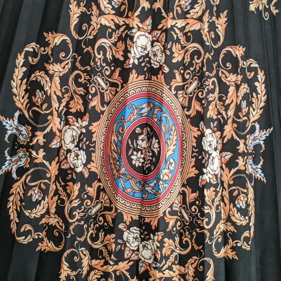 A pleated satin skirt in a stunning orange, black and blue baroque print. Narrow structured waistband with zipper for easy access, heat-pressed pleats, lined to about knee-length. This was sold as a midi skirt but I'm 5"2' and it's pretty much a maxi on me. Size 2/M/US6, fits like a US4 IMO. My goal in life is to look like a posh grandma's living room; this skirt almost fulfilled all my dreams but with the length and pleating it's too much skirt for me.