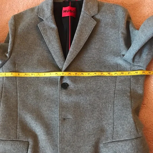 HUGO BOSS wool/cashmere winter coats beautiful gray color pocket on each side pocket with zipper inside too with slit in the back . Comes from smoke/pet free home all measurements are approximate so ask questions if your interested please I want you to be happy with your purchase. I usually ship same or next day unless it’s weekend or holidays.