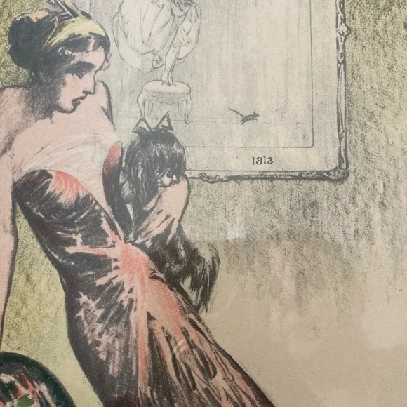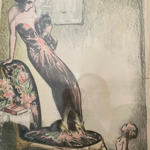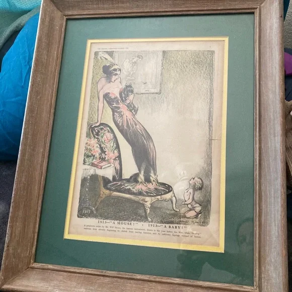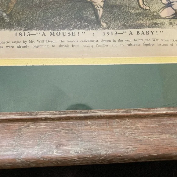A prophetic satire by Mr. Will Dyson, the famous caricaturist, drawn in the year before the War, when "Society" matrons were already beginning to shrink from having families, and to cultivate lapdogs instead of babies.Picture features a lady standing on a chair clutching her small black lapdog, looking down scared at a baby in a diaper on the floor, who’s looking back up at the woman…