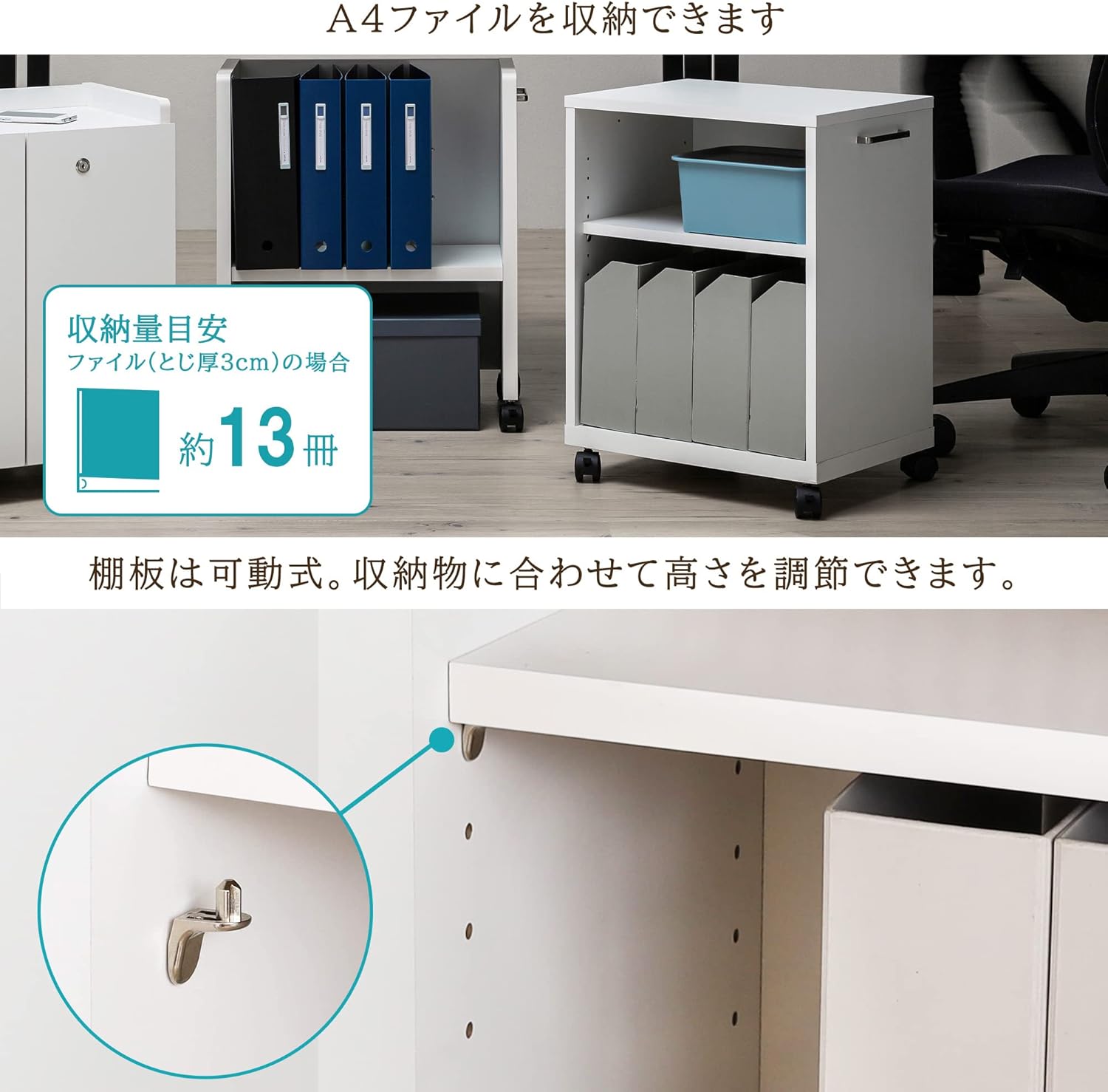 Simple design that is easy to use by SOHO (Small Office or Home Office). The casters make it easy to move around and can be placed under or next to your desk to store files.