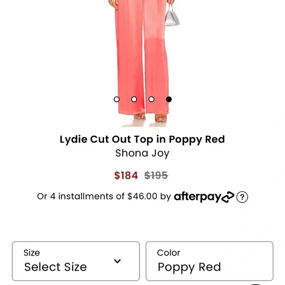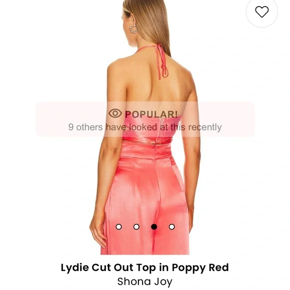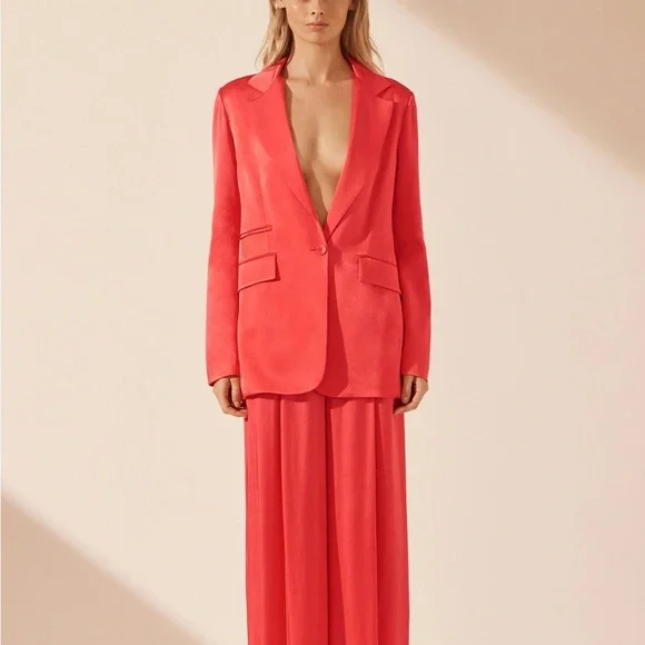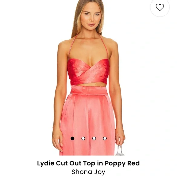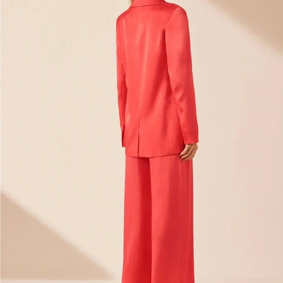 This Shona Joy Lydie 3 Piece suit honestly feels better than it looks and it looks beautiful. The set includes the blazer, halter and pants shown. It moves with your body and has a slightly draped look and feel.The color poppy is by my eye a reddish pink.The details posted are just for the top but you should be able to apply fabric and care to the blazer and pants.Worn once to an event. Good as new.Crop alone was $195, jacket $395 and pants $495
