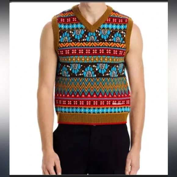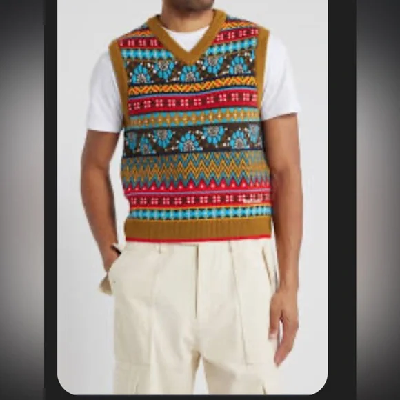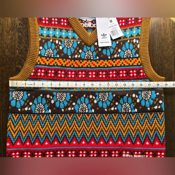 Funky meets preppy with the latest Wales Bonner x Adidas collection as they continue their shared lineage of cultural exploration. The pattern of the v-neck vest is inspired by Fair Isle, with seasonally-colored floral accents integrated into the design. with a slight stretch and finished with ribbed details at the arms, neck and hem and embroidered Trefoil at the back neck.UNISEX40% acrylic/30% polyester(recycled)/20% polyamide(recycled)/10% wool knit blend Measurements included in photos Never worn, new with tags From non smoking home
